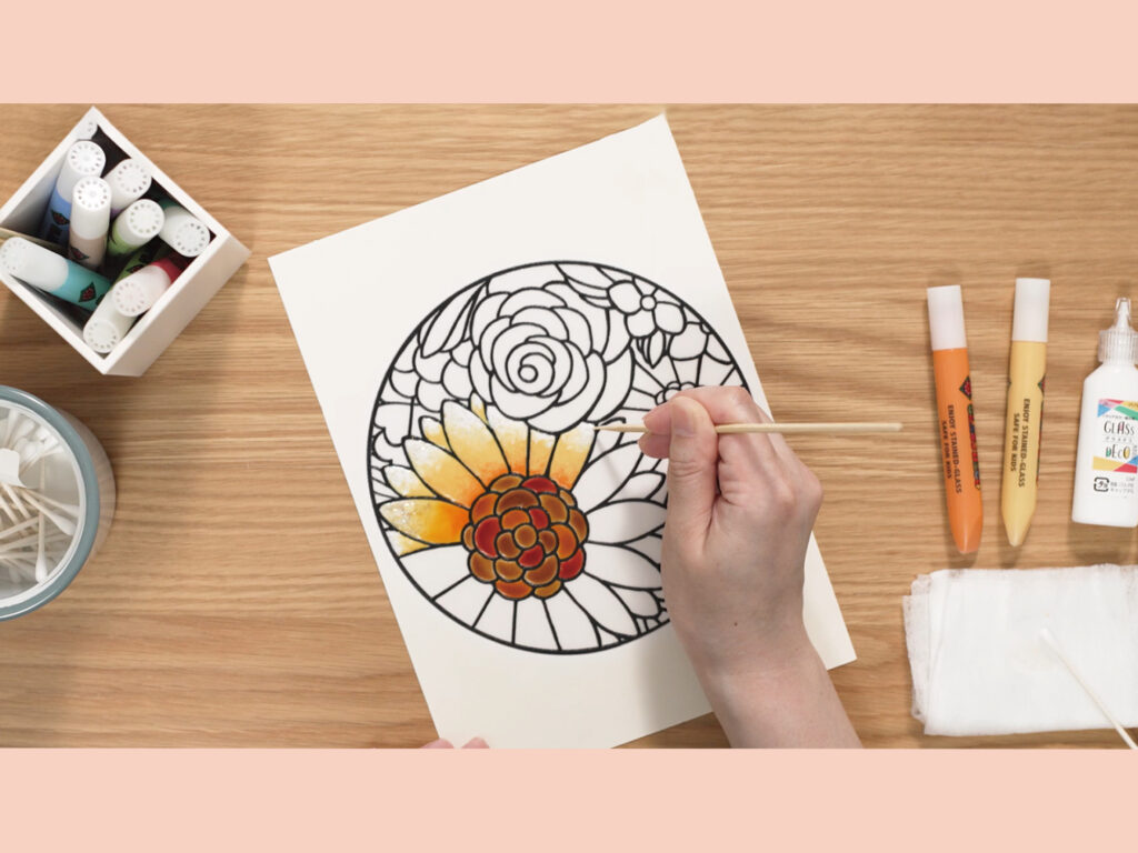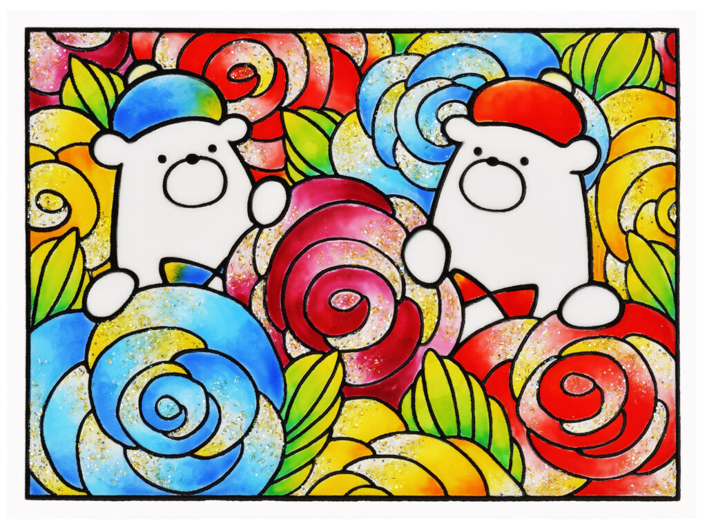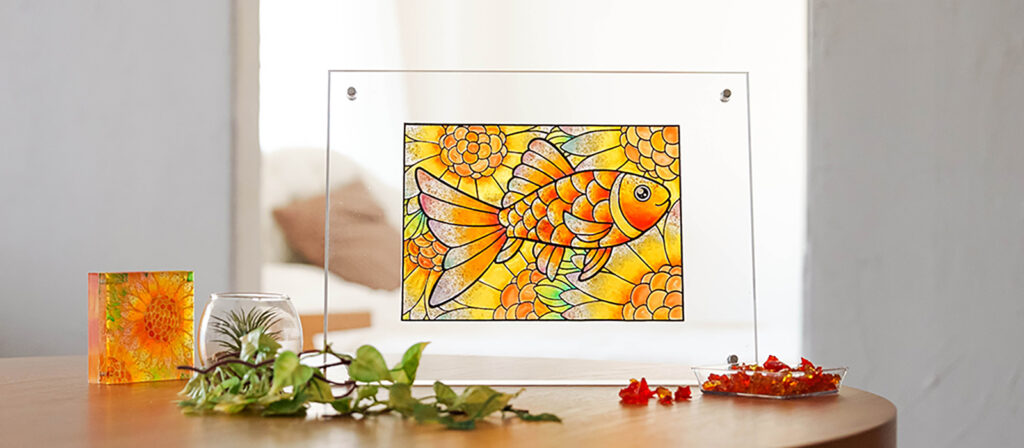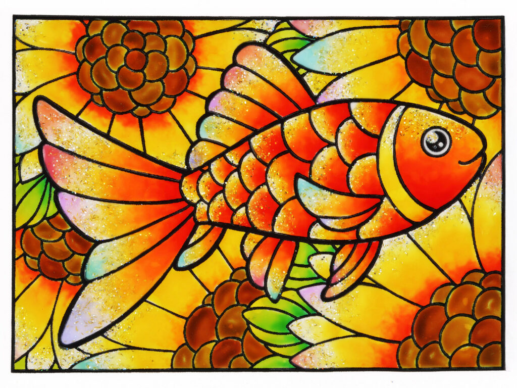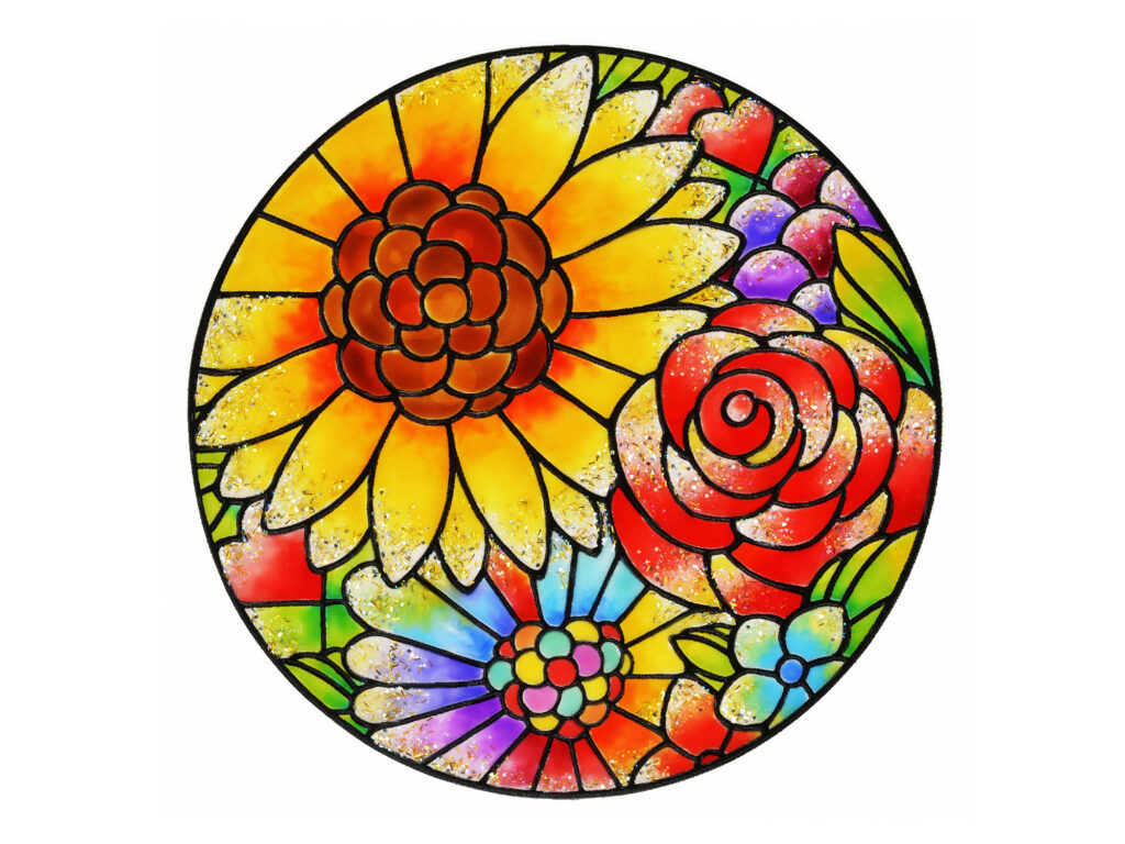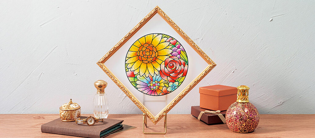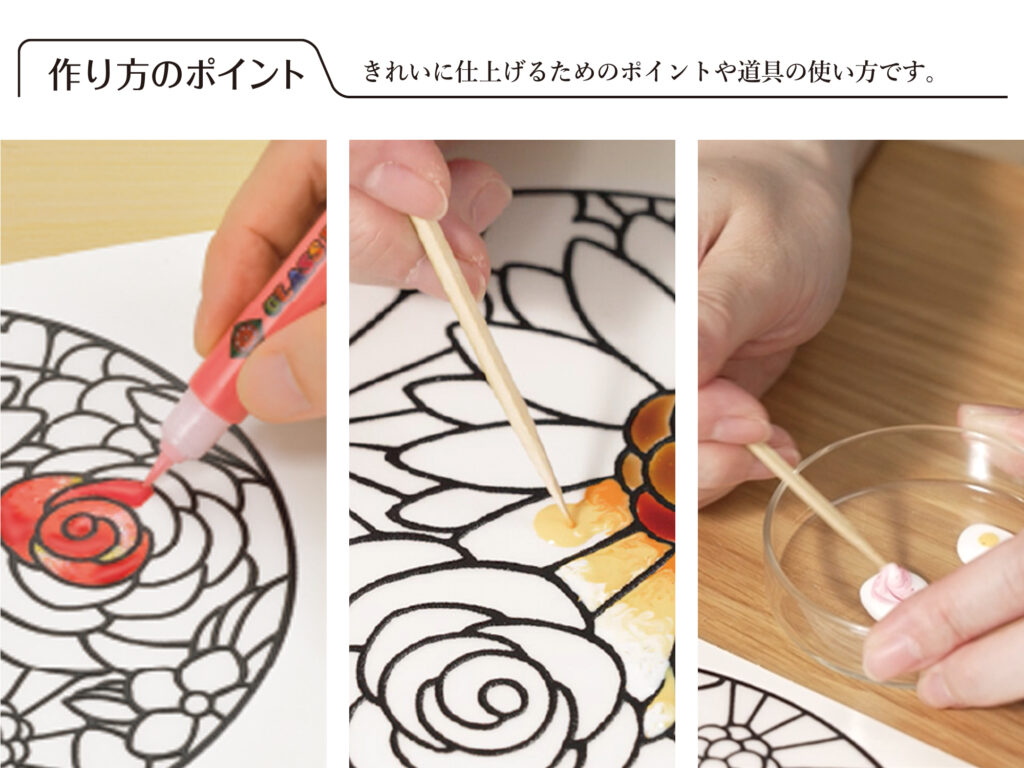 透明シールの黒い枠線の中をグラスデコで塗るだけで、ステンドグラス風のアートシールが作れます。