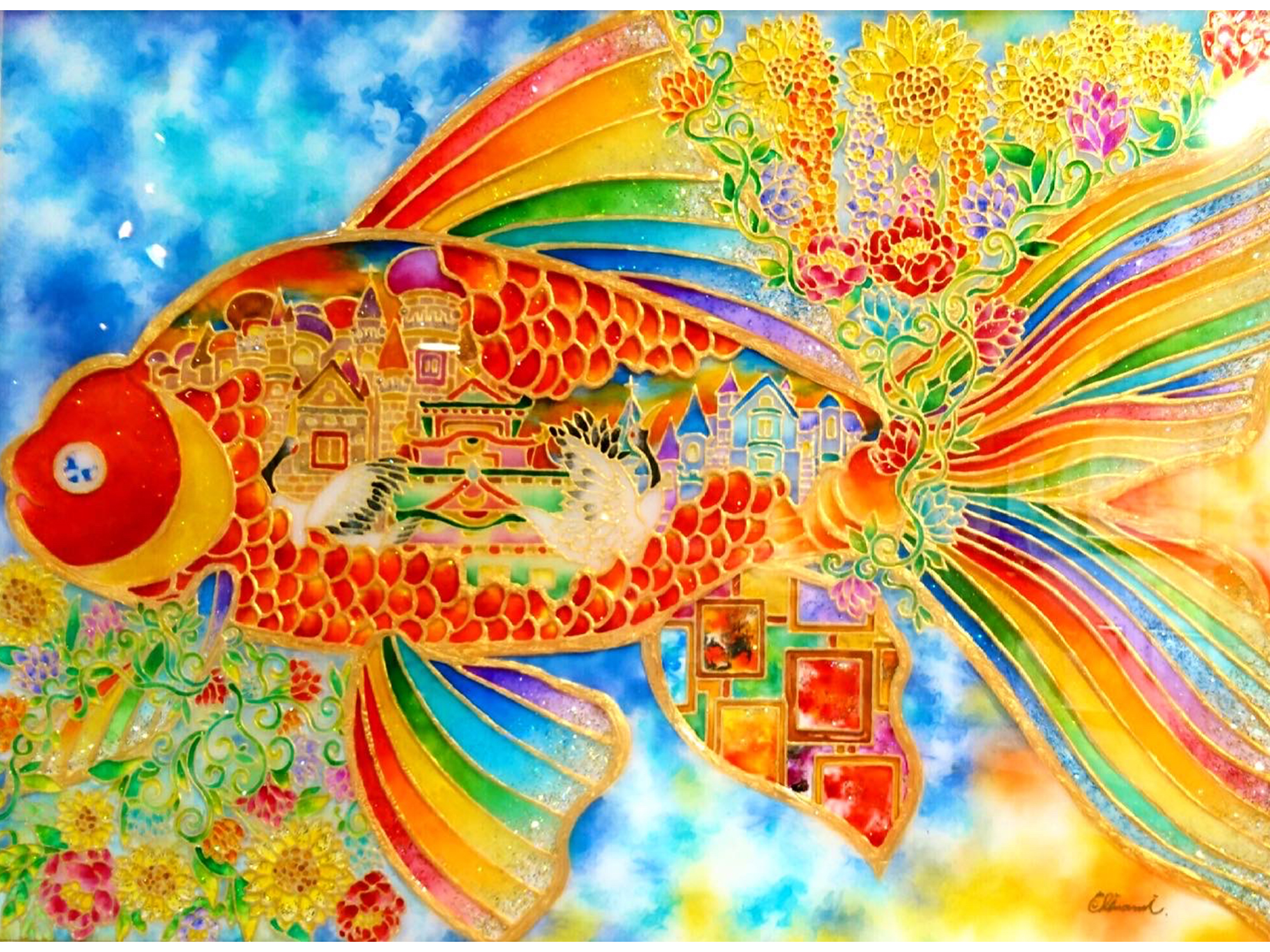 私の金魚好きが高じて生まれた金魚シリーズは、水槽5つに飼っている我が子(金魚)たちをモデルに描き続けてきました。金魚は縁起物としても広く親しまれており、水の中を泳ぐその姿には憧れの心も生まれます。