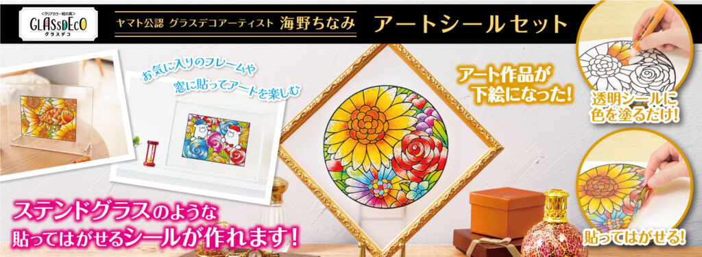 約10年以上に渡り当社の「グラスデコ」で作品を作り続けているヤマト公認のアーティスト海野ちなみ氏が描き下ろした下絵のシールが入ったセットで、繊細かつアーティスティックな作品を簡単に作ることができます。