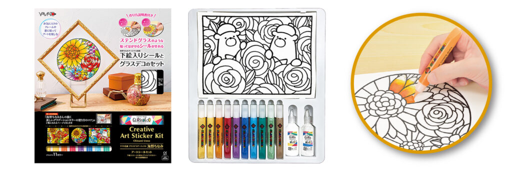 一方、アート市場やハンドメイド市場の活発化で、アートへの関心の高い大人層のニーズにも着目。この度、大人も楽しめる商品としてアーティストとのコラボキット「グラスデコ アートシールセット 海野ちなみ」をラインナップしました。