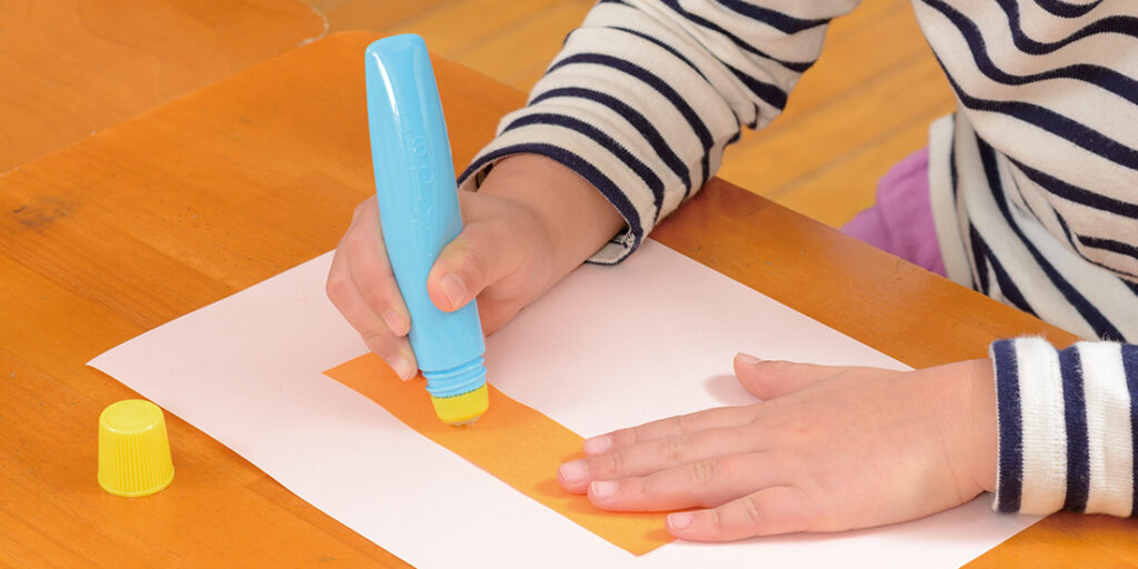 塗り口は、小さな穴が開いた特殊キャップとし、お子様でも塗りやすいやわらかな容器設計で、スムーズに糊を塗り広げることができます。
