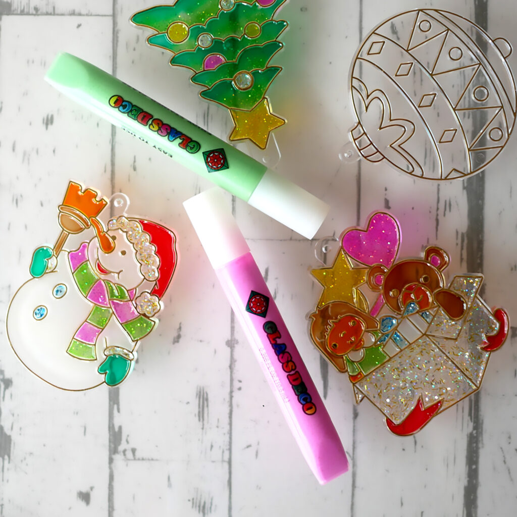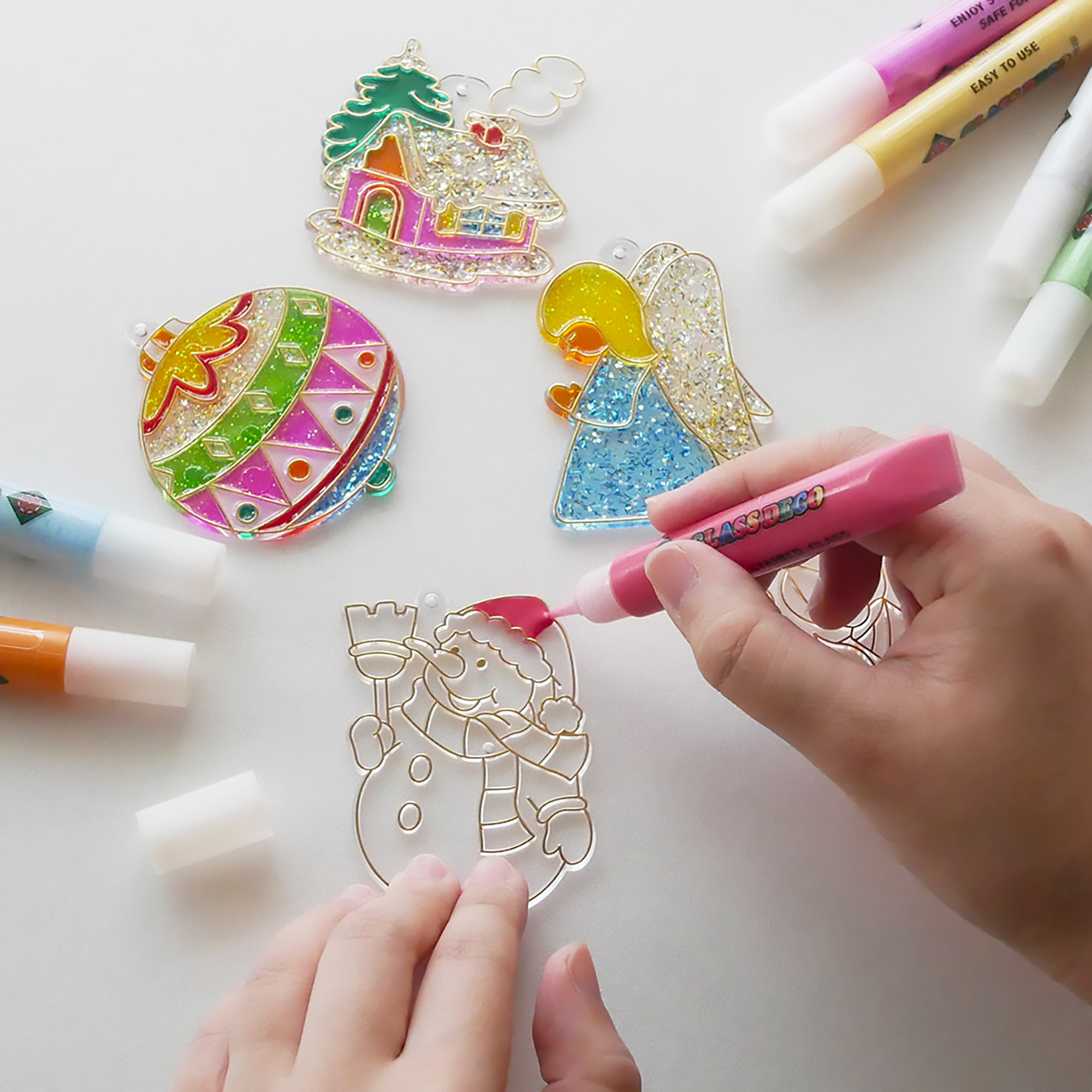 付属の透明プレートに好きな色を塗るだけで、カラフルで華やかなクリスマスオーナメントが簡単に作れます。