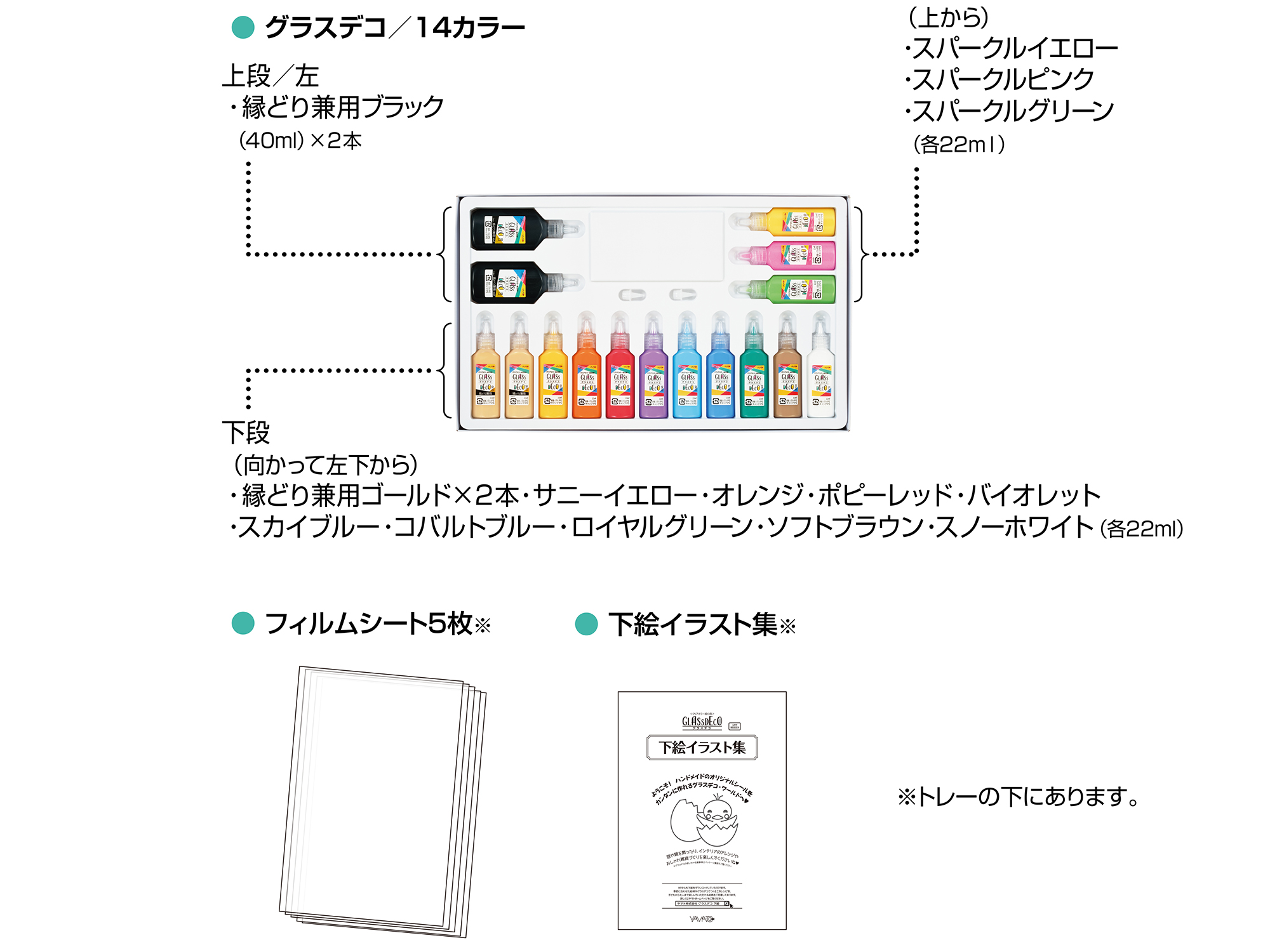 - セット内容:グラスデコ 22ml×14本、40ml×2本、スペアノズル 2コ、PPフィルムシート 5枚、下絵イラスト集