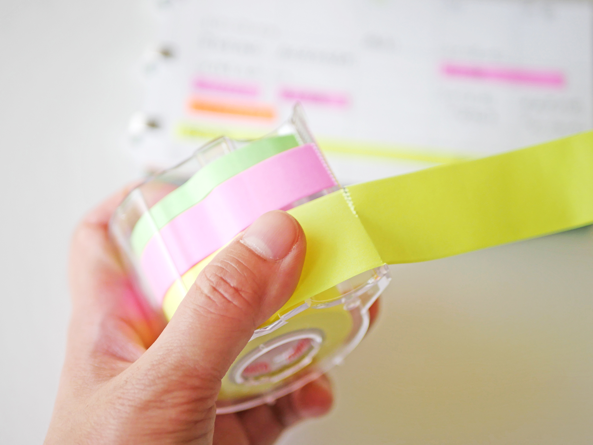 好きな長さにカットできる、ロールタイプのテープ型フセン。文字数や貼る場所にあわせて、必要な分だけ使えます。