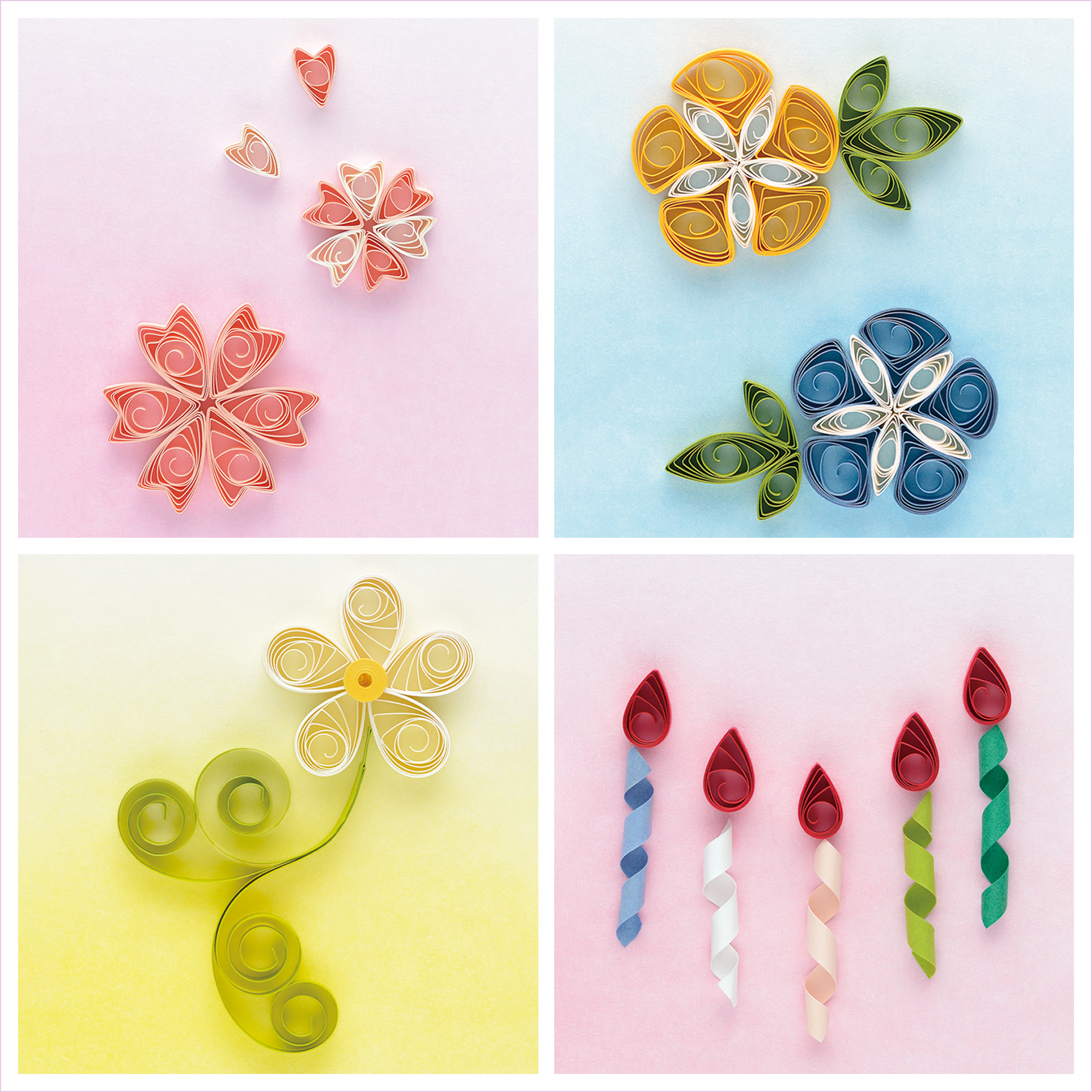 ペーパークイリングでつくる「春・さくら」「夏・あさがお」「おめでとう」「ありがとう」4つのグリーティングカードのレシピ。