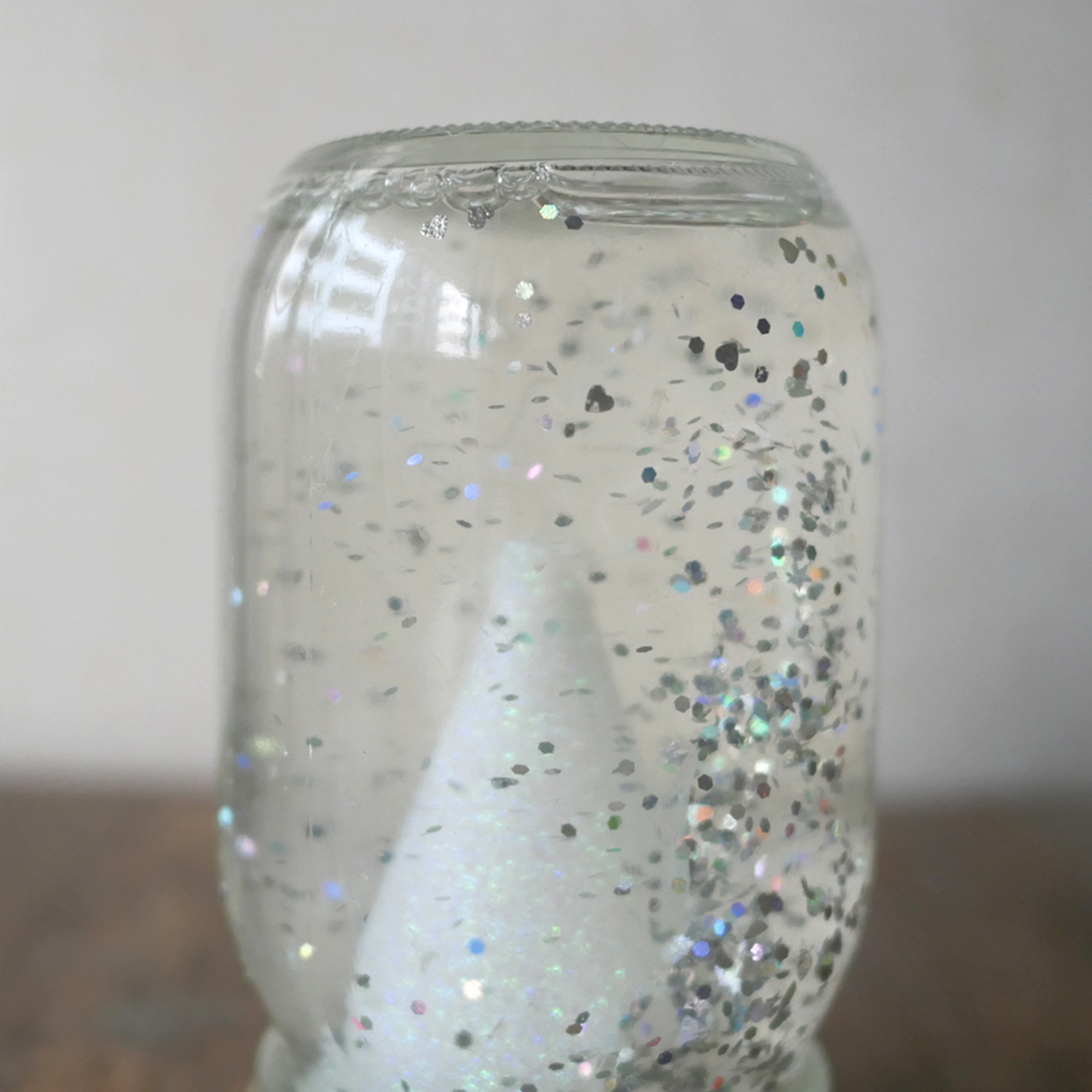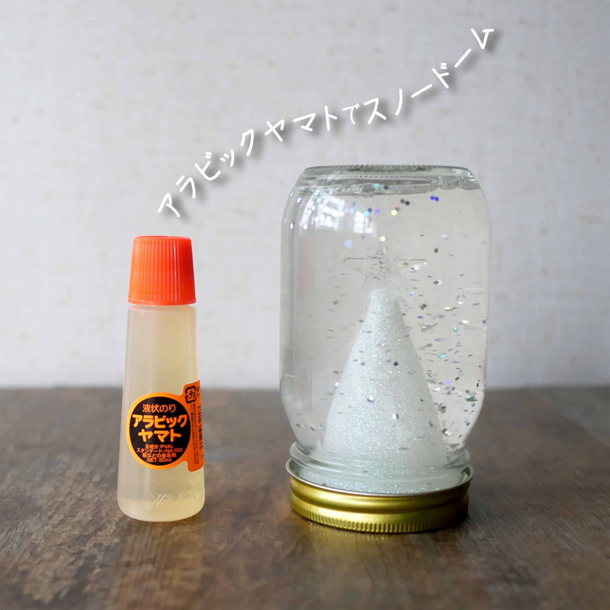 液体のり「アラビックヤマト」を水に混ぜて、小物やラメを入れるだけで簡単スノードームづくり。