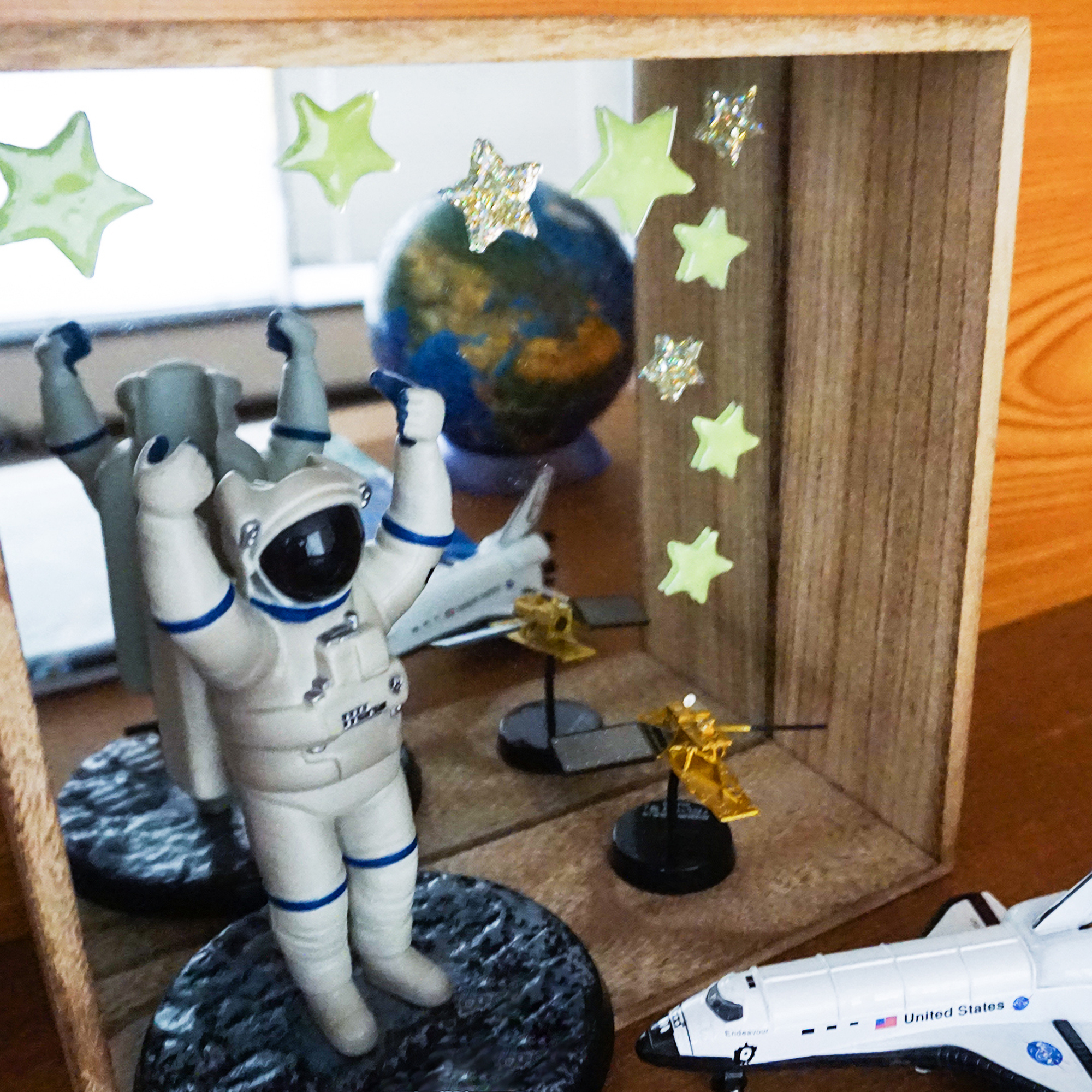 自然乾燥で約8時間、出来上がったきょうりゅうのプレートをビンに入れ、周りにグラスデコシールを貼ったらジオラマの完成!
